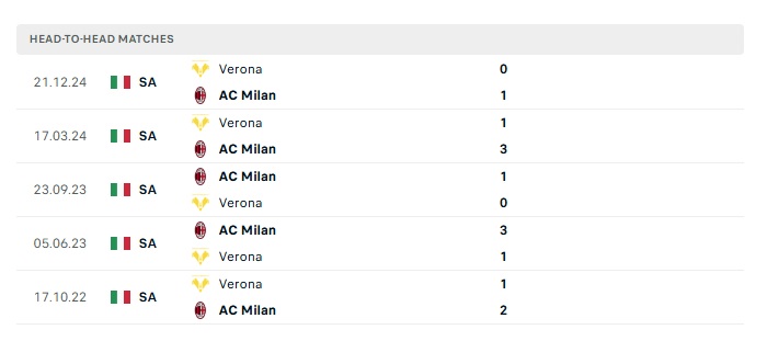 - Kèo tỷ số H2 AC Milan vs Verona: 2-0