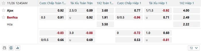 Bảng tỷ lệ kèo nhà cái Ajax vs Benfica