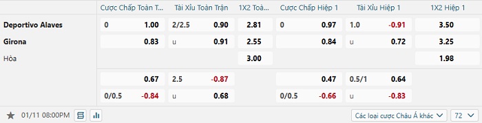 Bảng tỷ lệ kèo bóng đá Alaves vs Girona
