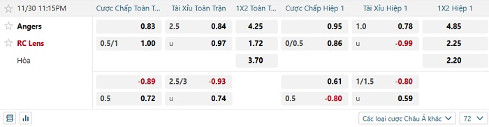 • Kèo tỷ số H1 Angers vs Lens: 0-1