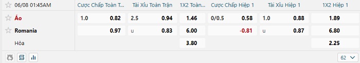 - Kèo tỷ số H2 Áo vs Romania: 1-1