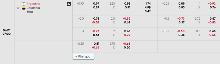 Bảng tỷ lệ kèo nhà cái Argentina vs Colombia
