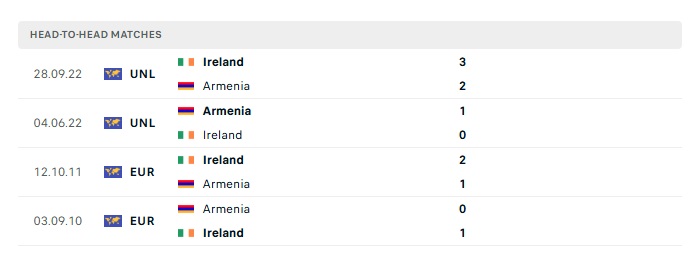 Với sức mạnh vượt trội của Ireland, họ rõ ràng quá tự tin để có cho mình 3 điểm trọn vẹn trước Armenia ngay trên sân khách. Bởi trong quá khứ, 2 đội từng có 4 lần gặp nhau và Ireland thắng đến 3. Bên cạnh đó thì trong 9 trận gần nhất của Armenia, họ được ghi nhận chỉ có 2 hòa, 1 thắng và thua 6. Do đó, kèo châu Âu trận đấu hôm nay sẽ có đội khách là lựa chọn tốt nhất dành cho người hâm mộ.