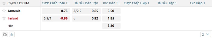 Bảng tỷ lệ kèo bóng đá hôm nay Armenia vs Ireland