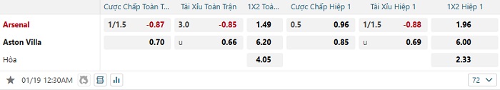 Bảng tỷ lệ kèo bóng đá Arsenal vs Aston Villa