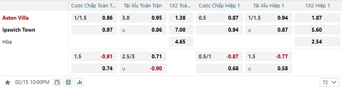 Bảng tỷ lệ kèo bóng đá Aston Villa vs Ipswich