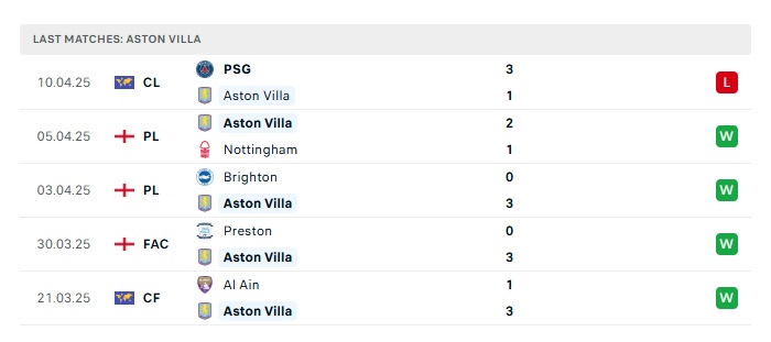 Phong độ gần đây Aston Villa vs PSG