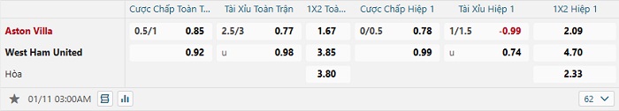 Bảng tỷ lệ kèo bóng đá Aston Villa vs West Ham