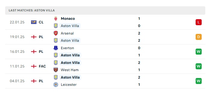 - Phong độ gần đây Aston Villa