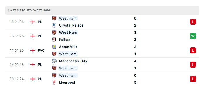 - Phong độ gần đây West Ham Utd