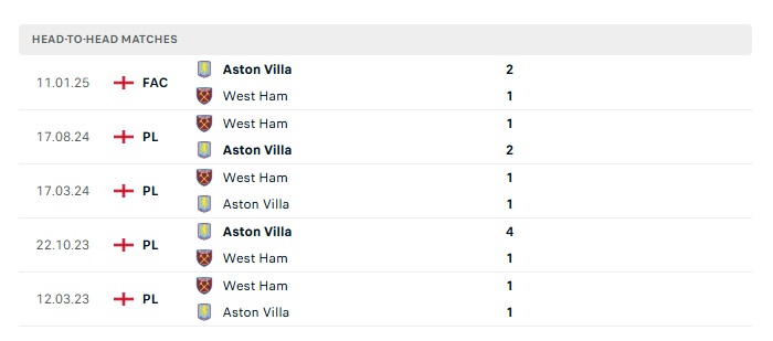 Lịch sử đối đầu Aston Villa vs West Ham Utd