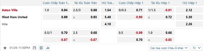 Bảng tỷ lệ kèo bóng đá Aston Villa vs West Ham Utd