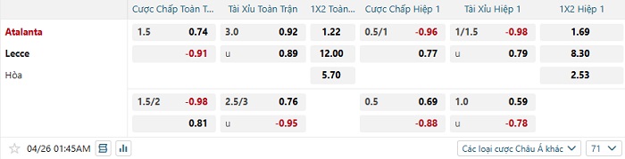Bảng tỷ lệ kèo nhà cái Atalanta vs Lecce