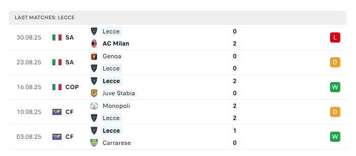 Hiện tại, phong độ của Atalanta đang không hề tốt như mong đợi và thậm chí kém hơn cả Lecce. Tính trong 5 trận đã qua, Atalanta chưa thắng với 3 hòa và 2 thua trong đó có 3 trận giao hữu. Trong khi đó thì Lecce đã thắng 2, hòa 2 và thua 1 trong 5 trận gần nhất và có 2 trong số đó là giao hữu, 1 trận Coppa Italia. Như vậy thì ngày hôm nay, Atalanta cũng được dự đoán sẽ chỉ thắng tối thiểu trước đối thủ.