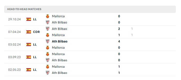 - Kèo tỷ số H2 Athletic Bilbao vs Mallorca: 3-0