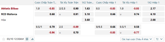Bảng tỷ lệ kèo bóng đá Athletic Bilbao vs Mallorca