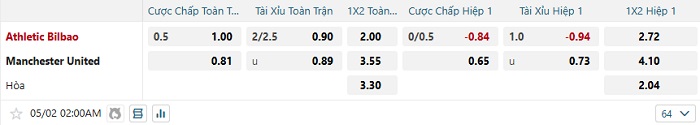 Bảng tỷ lệ kèo bóng đá Athletic Bilbao vs Man United