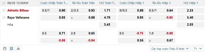 Bảng tỷ lệ kèo bóng đá Athletic Bilbao vs Rayo Vallecano