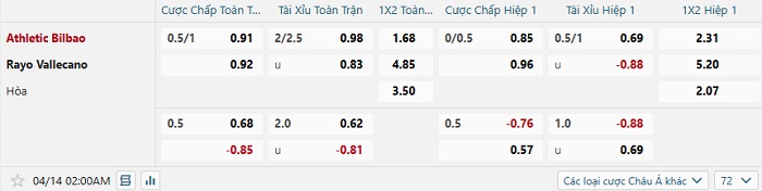 Soi kèo châu Á, kèo Athletic Bilbao vs Rayo Vallecano