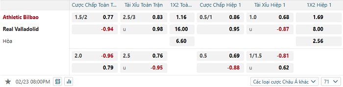 Bảng tỷ lệ kèo bóng đá Athletic Bilbao vs Valladolid