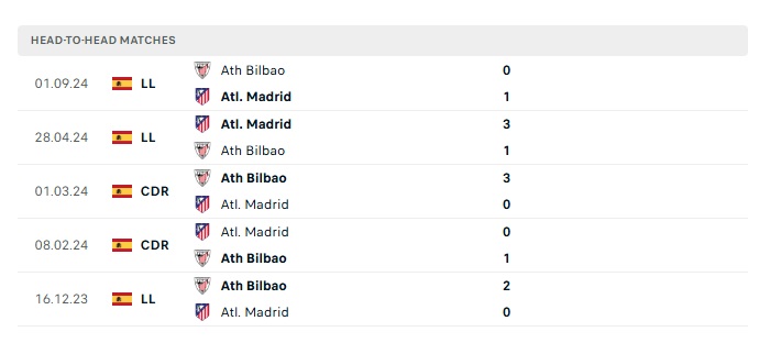 Lịch sử đối đầu Atletico Madrid vs Athletic Bilbao