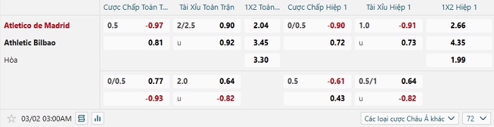 Bảng tỷ lệ kèo bóng đá Atletico Madrid vs Athletic Bilbao
