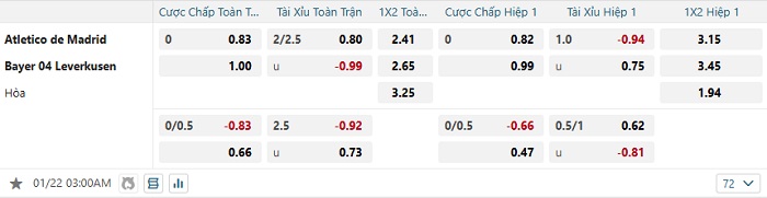 Bảng tỷ lệ kèo bóng đá Atletico Madrid vs Bayer Leverkusen