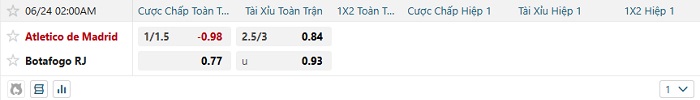 - Kèo tỷ số H1 Atletico Madrid vs Botafogo: 1-0