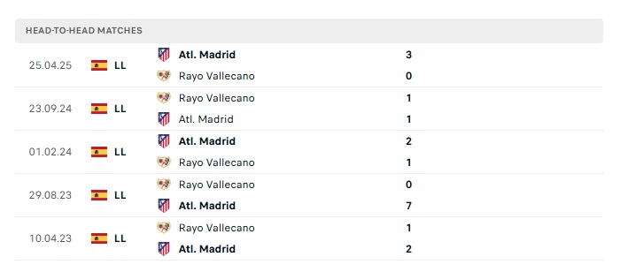 Lịch sử đối đầu Atletico Madrid vs Rayo Vallecano