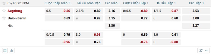 Bảng tỷ lệ kèo bóng đá Augsburg vs Union Berlin