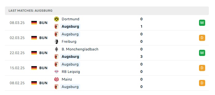Với các thống kê đã được đưa ra, phần lớn các chuyên gia đều nhận ra rằng chủ nhà Augsburg cần phải thi đấu an toàn trước đối thủ. Và trong hiệp 1, cả hai đều sẽ không có được bàn thắng sau 45 phút. Đến hiệp thi đấu thứ 2, họ thay đổi nhịp độ nhanh hơn khi cả hai đều muốn có bàn thắng. Thế nhưng kết quả vẫn là bất phân thắng bại khi cả hai đều có được cho mình 1 bàn thắng,