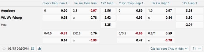 Bảng tỷ lệ kèo bóng đá Augsburg vs Wolfsburg