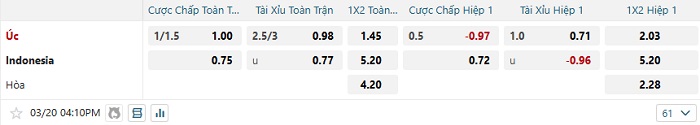 Bảng tỷ lệ kèo bóng đá Australia vs Indonesia