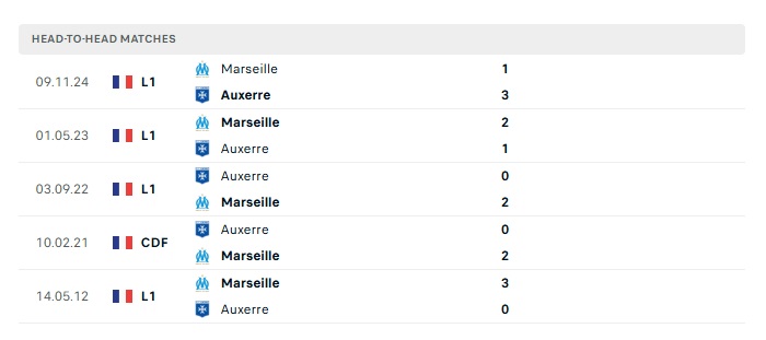 Lịch sử đối đầu Auxerre vs Marseille