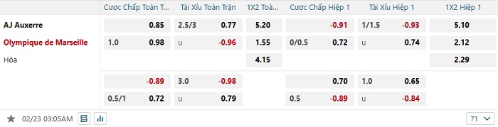 Bảng tỷ lệ kèo bóng đá Auxerre vs Marseille