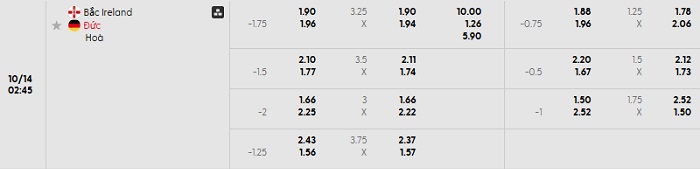 Bảng tỷ lệ kèo bóng đá hôm nay Bắc Ireland vs Đức