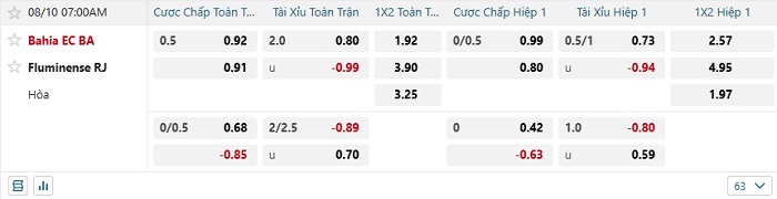 Bảng tỷ lệ kèo nhà cái Bahia vs Fluminense