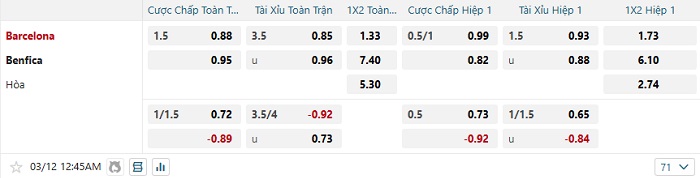 Bảng tỷ lệ kèo bóng đá Barcelona vs Benfica