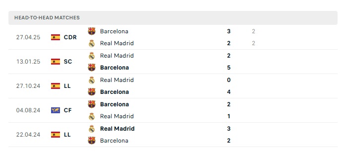 - Kèo tỷ số H2 Barcelona vs Real Madrid: 2-2