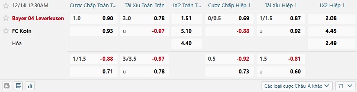 Bảng tỷ lệ kèo bóng đá Bayer Leverkusen vs FC Koln