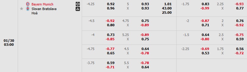 Bảng tỷ lệ kèo bóng đá Bayern Munich vs Slovan Bratislava