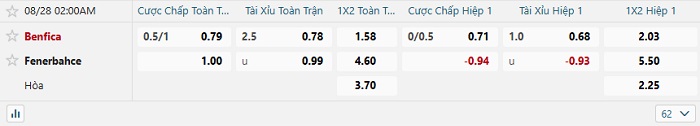 • Kèo tỷ số H1 Benfica vs Fenerbahce: 1-0