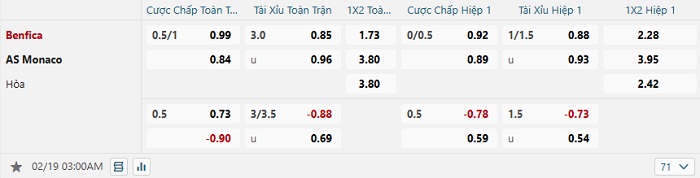 Bảng tỷ lệ kèo bóng đá Benfica vs Monaco