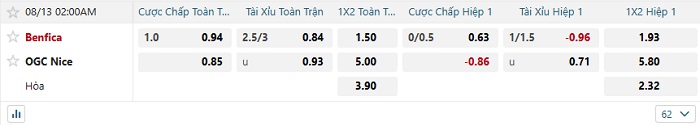 • Kèo tỷ số H2 Benfica vs Nice: 0-0