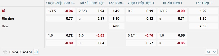 Bảng tỷ lệ kèo bóng đá Bỉ vs Ukraina