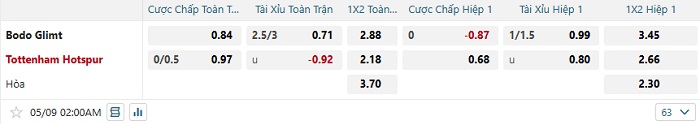 - Kèo tỷ số H2 Bodo Glimt vs Tottenham: 0-1