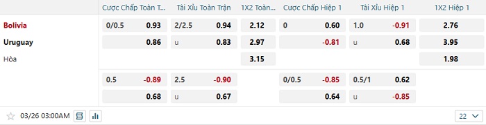 Bảng tỷ lệ kèo bóng đá Bolivia vs Uruguay