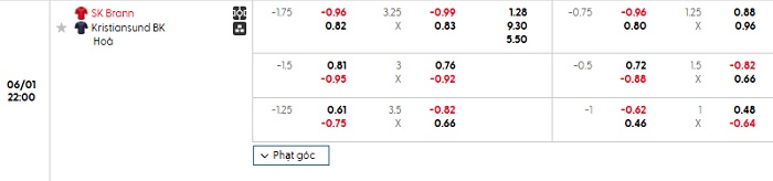- Kèo tỷ số H1 Brann vs Kristiansund: 2-0