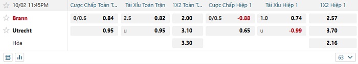 - Kèo tỷ số H2 Brann vs Utrecht: 2-0