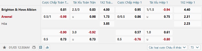 Bảng tỷ lệ kèo bóng đá Brighton vs Arsenal